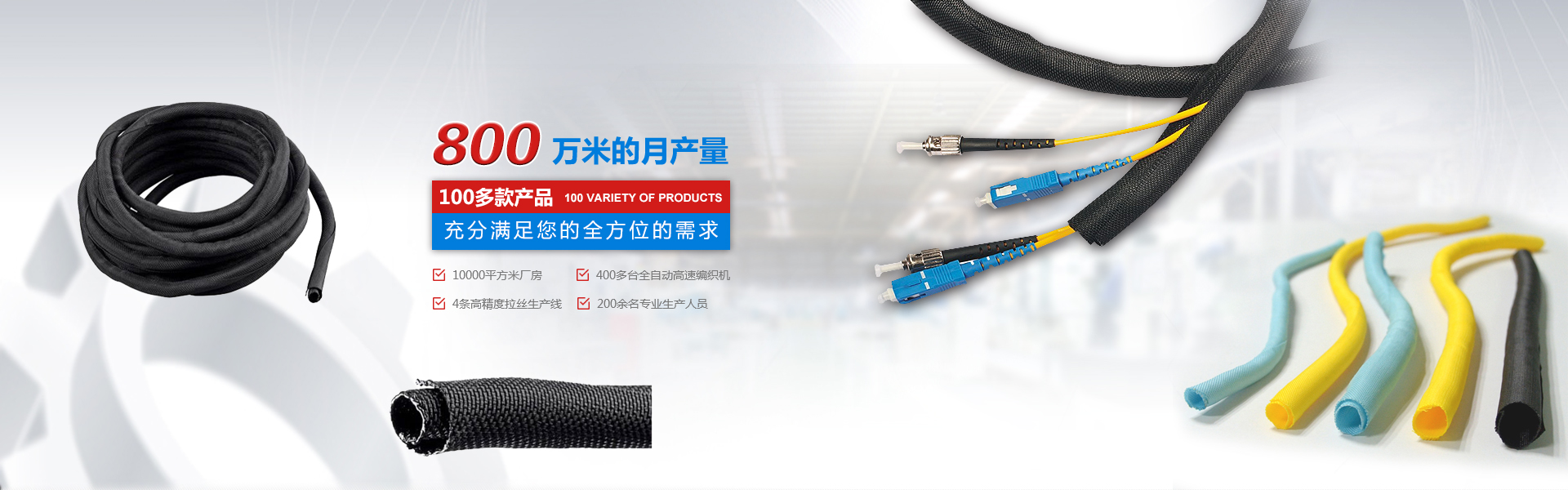 自主設計、研發、規模化大型生產企業 擁有廠房10000平米,400多臺全自動。高速編織機四條高精度紡絲生產線,員工200余人,月產量800萬米,中國最大絕緣保護套管生產企業之一。